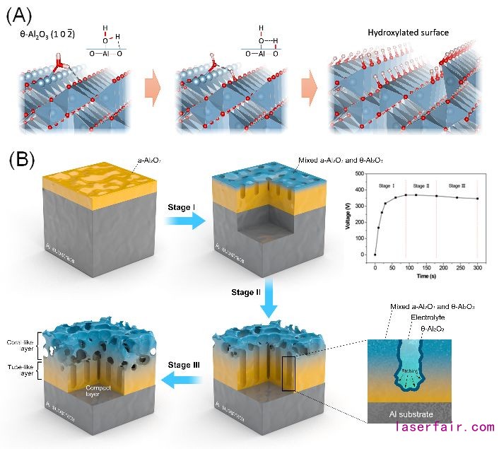 2004年Norskov 通過理論計(jì)算提出θ-Al2O3相在固/水界面具有負(fù)表面能( “A negative surface energy for alumina,” Nature Materials, vol. 3, no. 5, pp. 289–293),新材料學(xué)院研究團(tuán)隊(duì)基于自主研發(fā)的電弧等離子體和水基電解液的超臨界電化學(xué)技術(shù),通過調(diào)控高溫快冷與酸堿性變化等多步連續(xù)電化學(xué)反應(yīng),在鋁合金表面實(shí)現(xiàn)了多相氧化鋁微納結(jié)構(gòu)涂層的制備,并通過微刻蝕使得基于負(fù)表面能的θ-Al2O3納米相嵌在低表面能的微結(jié)構(gòu)表面,從而實(shí)現(xiàn)整體的超疏水性能。研究團(tuán)隊(duì)對其進(jìn)行了耐高溫,抗老化,耐磨及耐腐蝕等方面的測試,測試結(jié)果表明該涂層在明火烤燒,300 °C高溫加熱等處理后均能保持150°以上的超疏水性能;在日光下暴曬360天后,疏水角未發(fā)生明顯下降;在10 N載荷下與無紡布對磨2000次仍可以維持130°以上的疏水角;由于水滴在其表面不潤濕,其耐腐蝕性能突出,尤其是腐蝕電流達(dá)到10-10 A/cm2數(shù)量級。