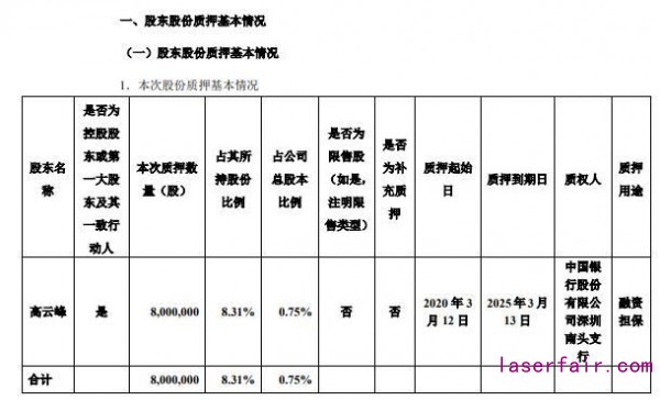 大族激光股東高云峰質(zhì)押800萬(wàn)股 用于融資擔(dān)保