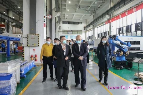陳總工帶領(lǐng)王廳長(zhǎng)一行參觀大族激光全球生產(chǎn)基地展廳和車(chē)間,詳細(xì)介紹了各種裝備和工藝