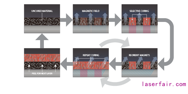 除了摻入添加劑,F(xiàn)ortify的CKM技術(shù)還將與其Fluxprint工藝結(jié)合使用,在打印的過(guò)程中為打印區(qū)域添加磁場(chǎng)。通過(guò)磁場(chǎng)使當(dāng)前打印層中的纖維按照相同的規(guī)律排列,并最終將其固化。因此,纖維的取向在固化的樹(shù)脂中得到保證,并且對(duì)每一層重復(fù)。這種逐層修改纖維方向的能力使用戶可以最終控制零件的方向?qū)傩浴?/p>