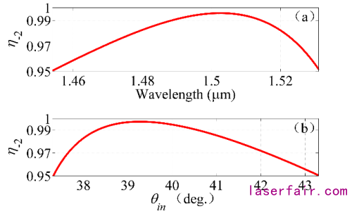 該結(jié)構(gòu)衍射效率最高可達(dá)99.58%,并且實現(xiàn)波長從1.454 μm-1.531 μm和入射角37.32°-43.3°范圍內(nèi)95%以上高效率輸出。研究結(jié)果表明,該結(jié)構(gòu)同樣具有優(yōu)良的容差特性,可行性強(qiáng),適合工業(yè)化大批量生產(chǎn)制作。