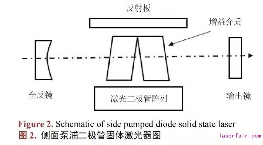 側(cè)面泵浦即橫向泵浦,是指將來自增益介質(zhì)側(cè)面的泵浦光射進(jìn)到增益介質(zhì)中,并且激光器的模式是沿著增益介質(zhì)的長度進(jìn)行振蕩。側(cè)面泵浦二極管固體激光器的工作方式是,在板條介質(zhì)的一端用激光二極管陣列,另一端是反射板,使激光大量聚合到增益介質(zhì)中,如圖2所示。通常,為了獲得均勻的激光泵浦分布,側(cè)面泵浦通常采用三向、五向?qū)ΨQ泵浦結(jié)構(gòu)。在五向?qū)ΨQ泵浦結(jié)構(gòu)中,二維陣列封裝在內(nèi)部有冷卻通道的熱沉上,由冷卻劑精確控溫使二維陣列發(fā)射波長在激光晶體的吸收峰附近。冷卻劑同時(shí)對激光晶體進(jìn)行冷卻,激光晶體和二維陣列用石英玻璃管隔開。圍繞著激光晶體棒還設(shè)置了反光塊,用來防止二維陣列的泵浦激光逸出,同時(shí)對激光模塊的機(jī)械部件進(jìn)行定位。采取三向、五向?qū)ΨQ泵浦結(jié)構(gòu)的側(cè)面泵浦方式通常能獲得超大功率輸出,側(cè)面泵浦方式被普遍應(yīng)用于切割太陽能電池板方面的激光劃片、(超)精細(xì)雕刻方面的激光打標(biāo)等需要大功率輸出。