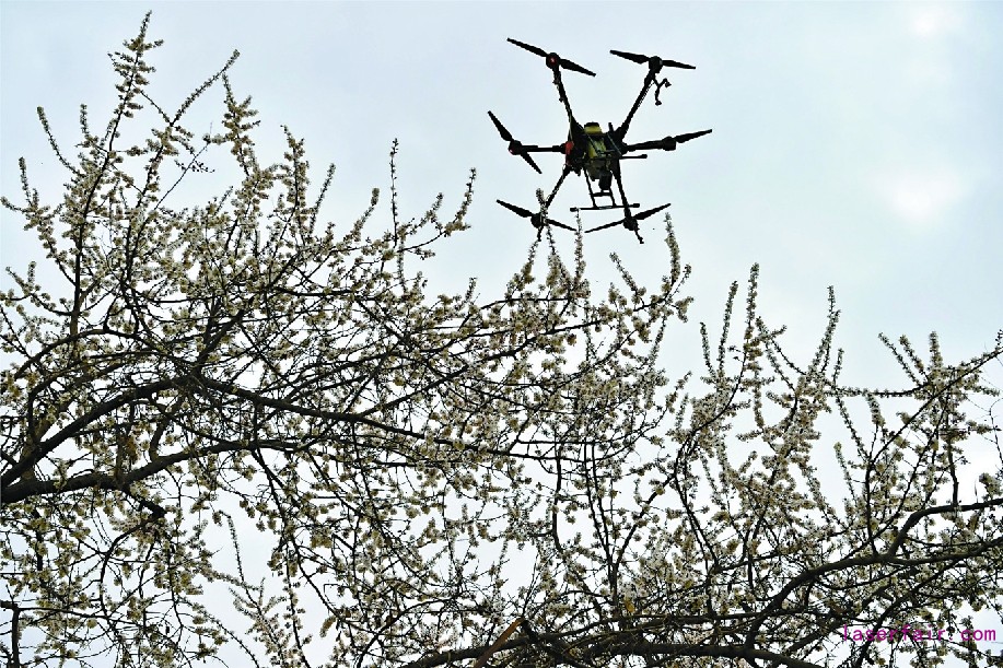 3月25日,果農(nóng)用無人機(jī)給盛開的杏花授粉。今年,阿拉爾市大力發(fā)展智慧農(nóng)業(yè),87萬畝杏、紅棗、蘋果普遍采用無人機(jī)授粉、施肥,此舉可以大幅度提高果品產(chǎn)量和質(zhì)量。孫國權(quán)...