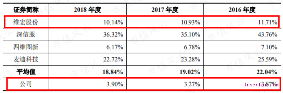 2016年至2018年公司研發(fā)費(fèi)用率分別為11.31%、9.88%、11.47%,維宏股份研發(fā)費(fèi)用率分別為23.45%、25.79%、28.72%。