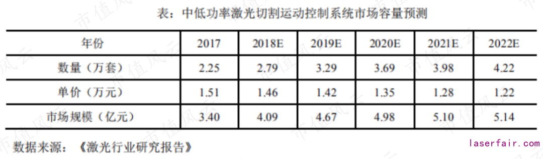 根據(jù)《激光行業(yè)研究報(bào)告》,我國中低功率激光切割運(yùn)動(dòng)控制系統(tǒng)需求量呈小幅增長趨勢(shì),單價(jià)小幅下降,市場(chǎng)規(guī)模穩(wěn)中有升,但總體規(guī)模不大,約5億左右。