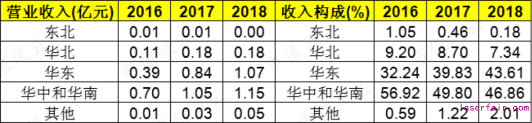 公司銷售主要面向華中、華南和華東,三個(gè)區(qū)域收入占比接近90%。