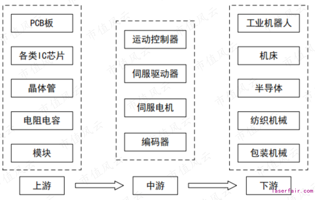 運(yùn)動(dòng)控制系統(tǒng)行業(yè)的上游是諸如PCB板、IC芯片、晶體管、電阻電容等電子元器件生產(chǎn)商。中游包括核心部件運(yùn)動(dòng)控制器、伺服驅(qū)動(dòng)器、伺服電機(jī)等。