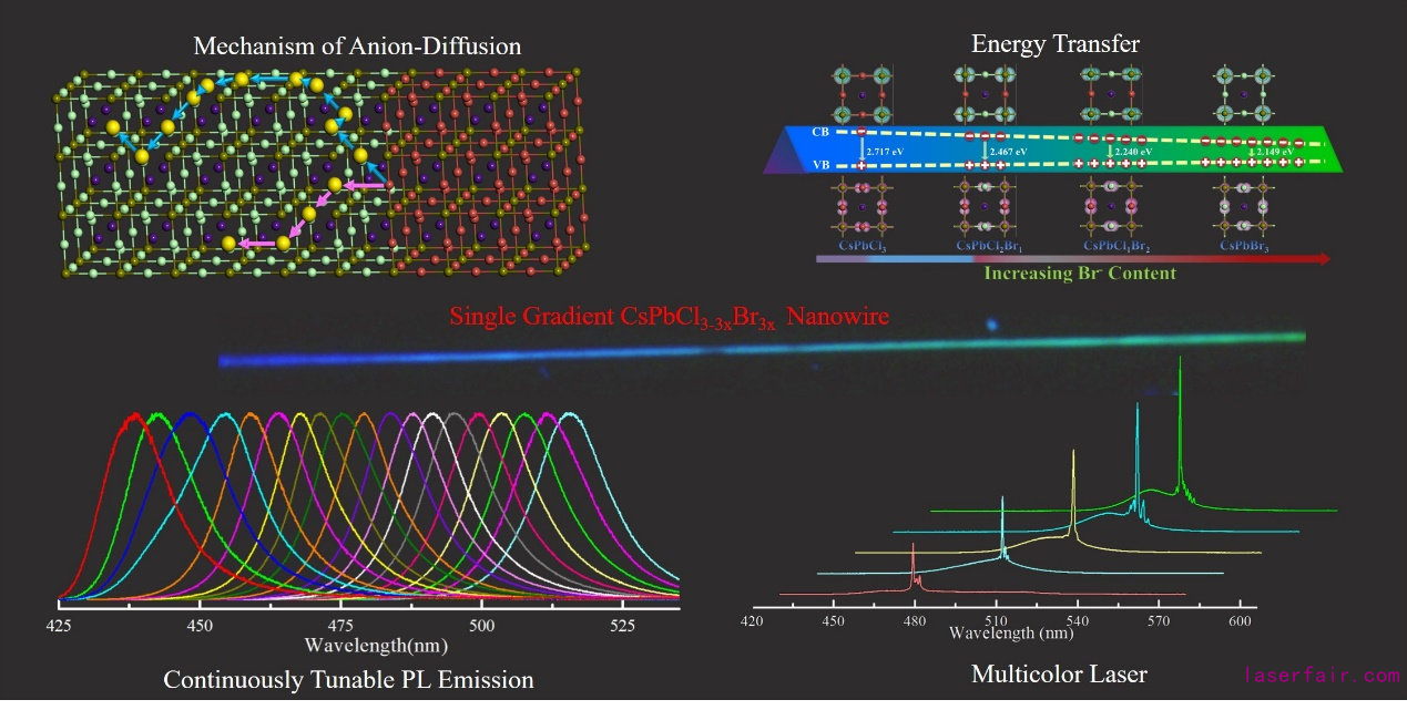 在該項研究中,研究人員首先通過改進的化學(xué)氣相沉積技術(shù)制備了高質(zhì)量鈣鈦礦納米線狀微腔,然后基于陰離子固相遷移反應(yīng)在單根納米線上成功實現(xiàn)了寬帶隙可調(diào)熒光發(fā)光。結(jié)合密度泛函理論,研究人員解析了鈣鈦礦納米結(jié)構(gòu)中陰離子遷移的原子路徑,揭示了離子遷移的基本過程并闡明其離子遷移的來源——小的離子遷移激活能,為材料離子遷移、相分離及光學(xué)性質(zhì)的研究奠定了堅實的理論及實驗基礎(chǔ)。動力學(xué)實驗進一步佐證了理論結(jié)果,隨著反應(yīng)時間的變化,單根納米線歷經(jīng)三個主要過程:首先,由發(fā)光一致的納米線逐漸變化為帶隙可調(diào)納米線;然后,納米線整體帶隙可調(diào),但是其帶隙隨著反應(yīng)時間增加而減小;最后,納米線被整體同化,轉(zhuǎn)化為發(fā)光一致的納米線,但整體發(fā)光波長較開始階段紅移。實現(xiàn)的納米線狀微腔具備規(guī)則的幾何結(jié)構(gòu)、光滑的表面及寬帶可調(diào)諧特性,可同時作為增益介質(zhì)及光學(xué)微腔,進而實現(xiàn)單根納米線寬帶可調(diào)諧激光輸出,實驗上成功獲得了480-525 nm的寬帶可調(diào)諧微納多色激光。
