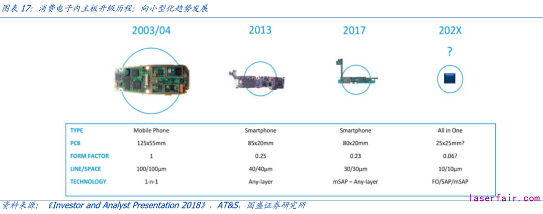 從過往消費(fèi)電子內(nèi)主板的演變歷史來看,我們可以看到在2003/2004年的時(shí)候消費(fèi)電子內(nèi)的PCB主要以普通HDI為主,但是至更高階的Anylayer HDI出現(xiàn)后,在消費(fèi)電子內(nèi)可以通過Anylayer HDI集成更多的元器件及芯片,且保證消費(fèi)電子整體體積不會(huì)有大的改變。