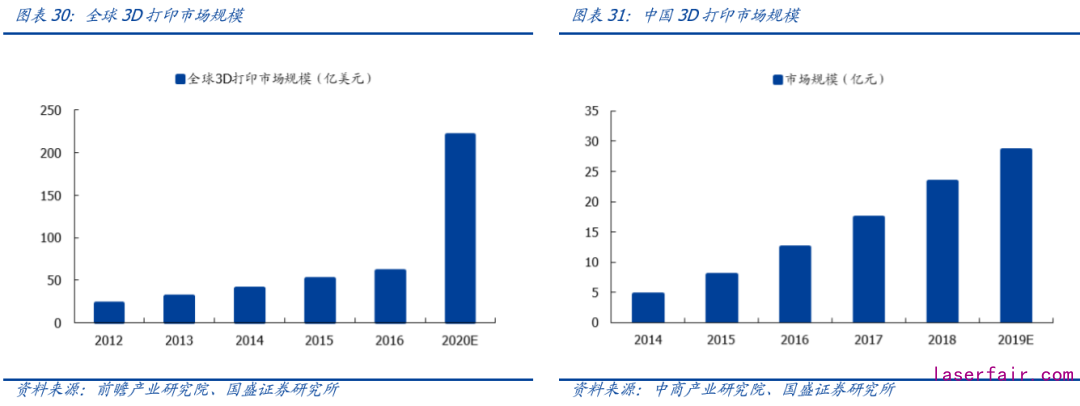 3D打印全球市場(chǎng)規(guī)模正在迅速發(fā)展,中國市場(chǎng)空間巨大。3D打印的市場(chǎng)規(guī)模由2012年的23億美元增加至2016年的60.6億美元,年均復(fù)合增長率為20.40%。根據(jù)前瞻預(yù)計(jì), 2020年全球3D打印市場(chǎng)規(guī)模有望超過220億美元。中國引進(jìn)3D打印技術(shù)較晚,雖與國外有一定差距,但近年的發(fā)展也比較可觀。根據(jù)《2019年3D打印行業(yè)市場(chǎng)前景及投資研究報(bào)告》,2018年中國3D打印市場(chǎng)規(guī)模為23.6億元,同比增長42%。伴隨著航天航空,汽車行業(yè)對(duì)3D打印需求的增加以及中國技術(shù)的不斷發(fā)展,預(yù)計(jì)2019年中國3D打印市場(chǎng)規(guī)模將近30億元。