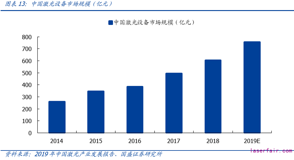我國激光產(chǎn)業(yè)正在高速發(fā)展。2018年中國激光設(shè)備市場(chǎng)規(guī)模達(dá)到605億元,同比增長22.22%,2011年至2018年復(fù)合增速達(dá)26.45%。根據(jù)《2019年中國激光產(chǎn)業(yè)發(fā)展報(bào)告》,2019年中國激光設(shè)備市場(chǎng)規(guī)模將超過700億元,增速保持20%以上。