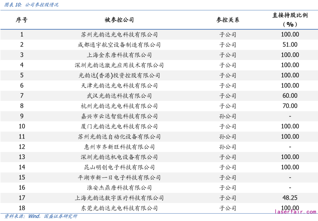 公司控股和參股的公司較多,子公司和孫公司的主要業(yè)務(wù)都聚焦于激光應(yīng)用服務(wù)、智能裝備和航空航天領(lǐng)域。