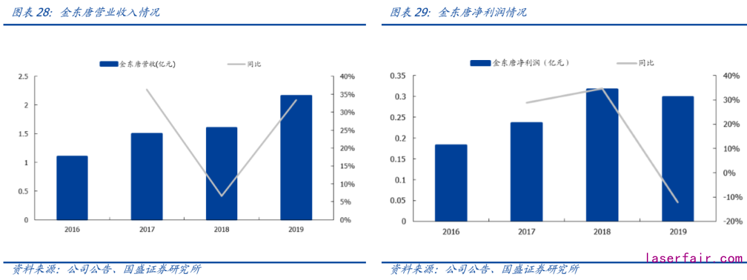 收購金東唐是公司向激光產(chǎn)業(yè)鏈中游裝備拓展的重要一環(huán),業(yè)務(wù)拓展為從服務(wù)到解決方案,從檢測(cè)設(shè)備到智能裝備、生產(chǎn)檢測(cè)一體化的智能生產(chǎn)線或生產(chǎn)設(shè)備都能提供。我們認(rèn)為此舉可以幫助金東唐和公司實(shí)現(xiàn)雙贏,除了客戶資源共享,公司的定制化產(chǎn)品模式可以向標(biāo)準(zhǔn)化拓展,以此擴(kuò)大銷售模式,增強(qiáng)盈利能力。