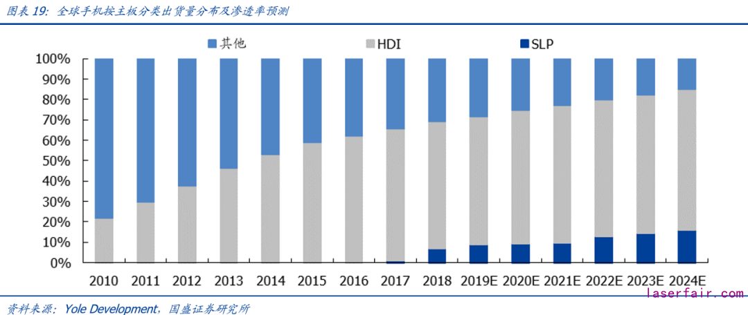 根據(jù)Yole Development的統(tǒng)計(jì),在2010年全球手機(jī)出貨量中所有主板為HDI的手機(jī)出貨量占總出貨量的約22%,而至2018年時(shí)其占比提升至62.55%,再到2024年,預(yù)期HDI的出貨數(shù)量將會(huì)占到手機(jī)端的69.32%。
