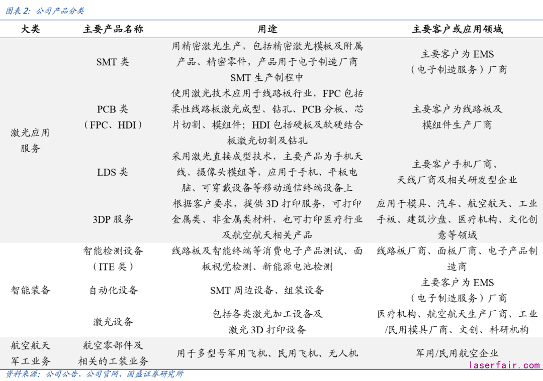 公司的主營業(yè)務(wù)主要有三大類:應(yīng)用服務(wù)的精密激光技術(shù)+智能裝備的智能控制技術(shù)+航空零組件及軍工業(yè)務(wù)。