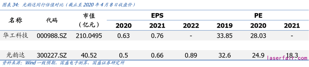 我們選取華工科技(20.720-0.28-1.33%)作為估值的比較對(duì)象,華工科技同樣以激光為主業(yè),已形成的激光裝備制造、光通信器件、激光全息仿偽、傳感器、信息追溯的產(chǎn)業(yè)格局基礎(chǔ)上,針對(duì)全球“再工業(yè)化”發(fā)展趨勢(shì)以及自身特點(diǎn),集中優(yōu)勢(shì)資源發(fā)展智能制造關(guān)鍵產(chǎn)品及解決方案。一定程度上華工科技與光韻達(dá)所處行業(yè)相似,從而我們對(duì)其進(jìn)行估值對(duì)比。目前可以看到2020年及2021年光韻達(dá)的估值仍然略低于華工科技,估值相對(duì)較低,對(duì)應(yīng)光韻達(dá)當(dāng)前股價(jià)PE在2020年至2022年分別為32.6/24.9/18.3x,首次覆蓋,給予“買入”評(píng)級(jí)。