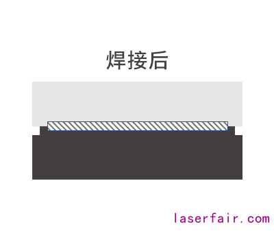兩種或兩種以上的(同種或異種)塑料部件,通過(guò)激光光束穿透上層透光材料,透射到下層吸光材料,兩部件受熱膨脹,激光能量被下層吸光部件吸收轉(zhuǎn)化為熱能,熔化其表面,再通過(guò)熱傳導(dǎo),將熱能傳遞到上層透光部件上,在內(nèi)部膨脹力與外部夾具壓力的協(xié)同作用下產(chǎn)生充分熔合,完成上下部件的牢固焊接。激光光束和焊接部件的相對(duì)移動(dòng)形成焊縫。其焊接原理如下圖所示: