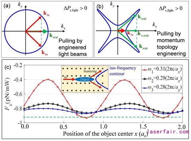 圖.基于動(dòng)量拓?fù)浣Y(jié)構(gòu)調(diào)控的光學(xué)牽引力產(chǎn)生機(jī)制(a,b),以及在周期光子晶格結(jié)構(gòu)中的實(shí)現(xiàn)(c)