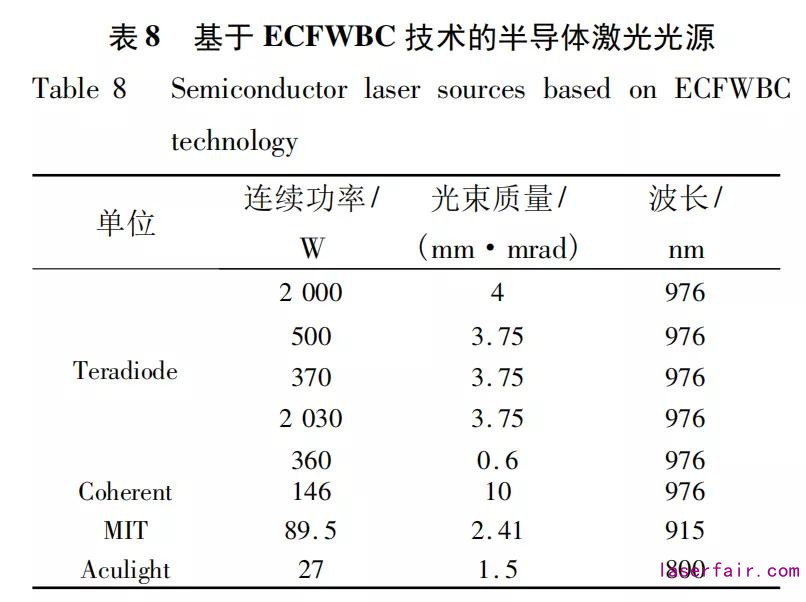 美國麻省理工( MIT) 、美國 Teradiode、美國Coherent、美國 Aculight、法國 Thales 和丹麥科技大學(DTU) 在 ECFWBC 技術(shù)的研究上取得了重要進展,如表 8 所示。美國 Teradiode 公司已達到商品化水平,2012 年,其 2 030 W 半導(dǎo)體激光合束光源產(chǎn)品已達到相同功率條件下商用全固態(tài)激光水平。