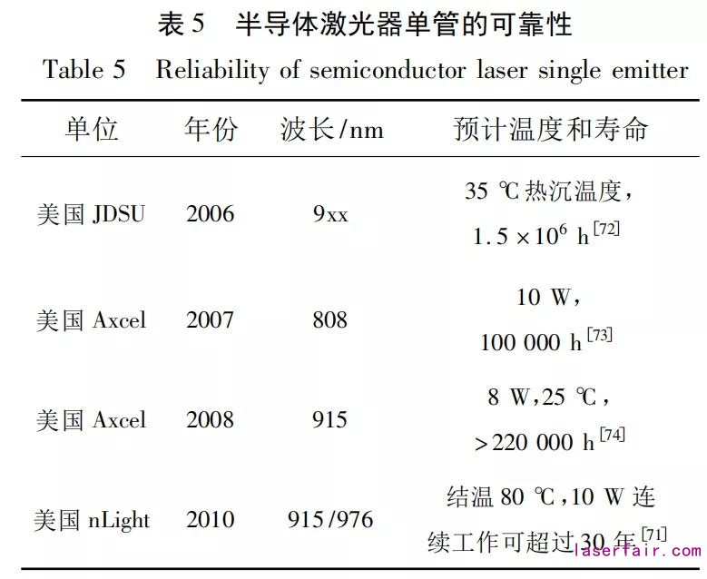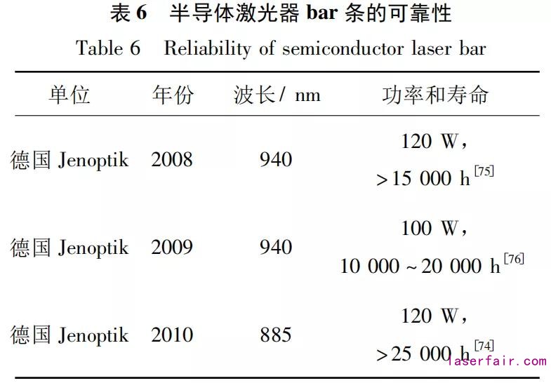 近年來,由于半導(dǎo)體激光器轉(zhuǎn)換效率的提升和封裝散熱工程的改進,半導(dǎo)體激光器單管報道的最長壽命很多已達到十萬小時以上,線陣的可靠性也有了非常明顯的提高。單管和 bar 條的研究進展如表 5 和表 6所示。