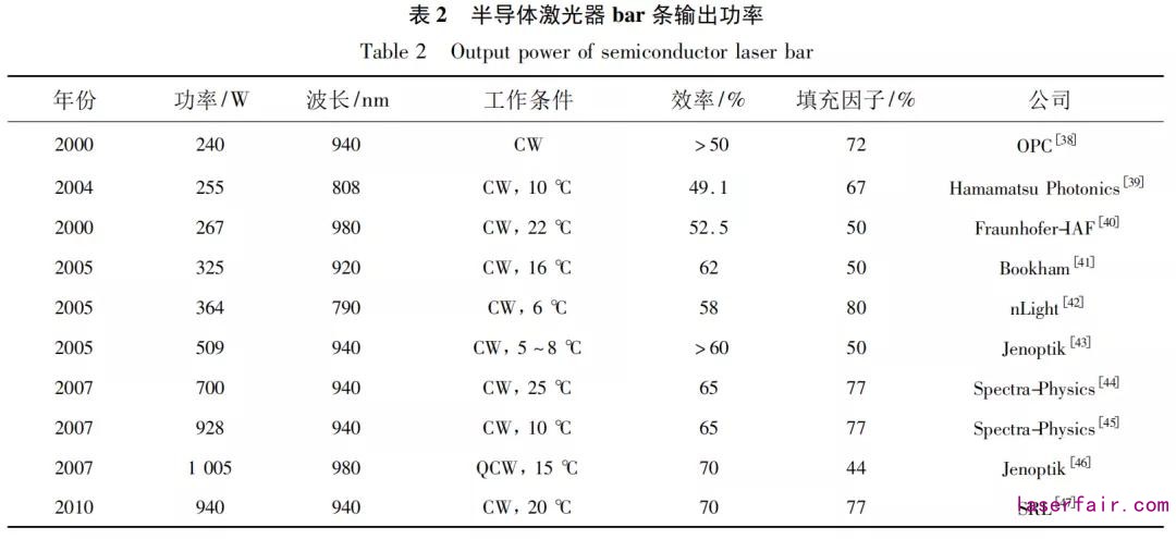 隨著技術(shù)發(fā)展和單管輸出功率的提高,半導(dǎo)體激光bar條的輸出功率也顯著增加。厘米 bar條的輸出功率從 2000 年時的 240 W 已經(jīng)提高至1 000 W 左右,增大到原來的 4 倍,增長非常迅速,如表 2 所示。