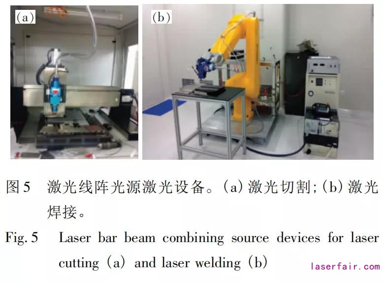 基于線陣合束光源,我 們 研 制 出 200 μm / 0.2NA光纖連續(xù) 400 W 功率輸出的激光器,可用于薄不銹鋼板的切割; 研制出 200 μm /0.2NA 光纖連續(xù) 3 000 W 功率輸出的激光器,用于金屬板焊接。設(shè)備照片如圖 5 所示。