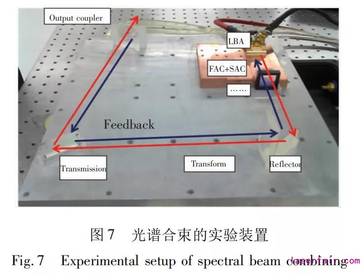 我們利用基于透射光柵的外腔 WBC 技術(shù),先后研制出 808 nm、970 nm 的幾十瓦至數(shù)百瓦的光譜合束光源,光束質(zhì)量僅為 3 ~ 5 mm·mrad,接近激光單元的光束質(zhì)量。圖 7 為光譜合束的實驗裝置。