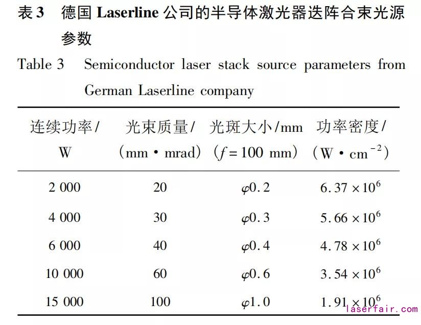 德國Laserline公司基于激光器迭陣,結(jié)合平行平板堆整形方法和激光合束技術(shù),已研制出了多種半導(dǎo)體激光直接加工機,代表參數(shù)如表 3 所示。15 kW 功率的光束質(zhì)量為 100 mm·mrad,2 kW 功率的光束質(zhì)量為20 mm·mrad,后者超過了相同功率下燈泵 Nd∶ YAG 激光的光束質(zhì)量。該公司半導(dǎo)體激光光源保質(zhì)期長達 5 年( 43 800 h) ,是燈泵 Nd∶ YAG 激光( < 2 000 h) 的數(shù)十倍,這使得它在材料加工市場非常具有競爭力。目前該公司產(chǎn)品已直接應(yīng)用在熔覆、表面強化、金屬焊接和深熔焊等材料加工領(lǐng)域。