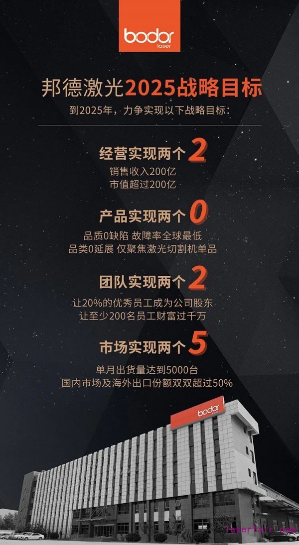2020年作為世界經(jīng)濟(jì)發(fā)展的轉(zhuǎn)折年!邦德激光積極求變,奮進(jìn)前行,抓住這一歷史機(jī)遇,發(fā)布“邦德激光2025戰(zhàn)略目標(biāo)”?!?025戰(zhàn)略目標(biāo)”主要涉及以下四個(gè)維度: