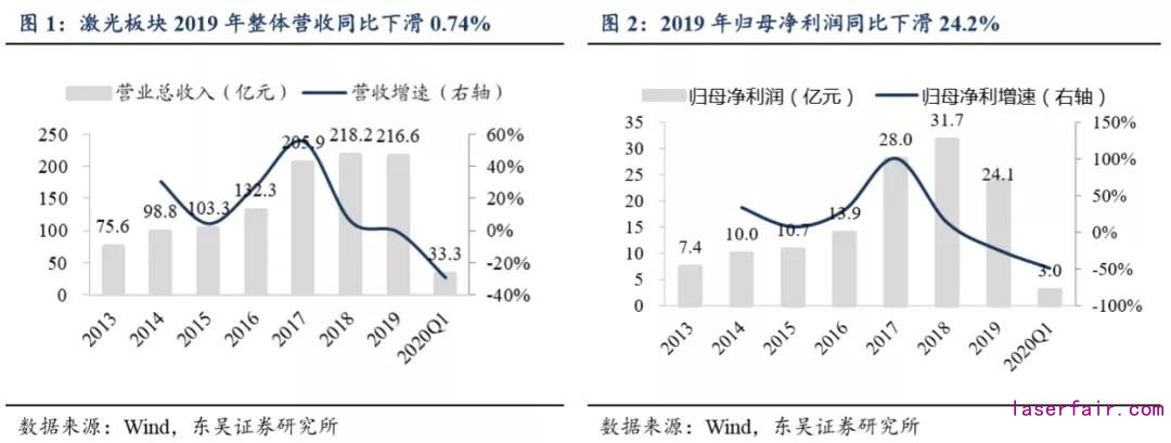2020Q1受疫情影響業(yè)績降幅較大。2020Q1激光板塊營收及凈利潤有所下滑,共實現(xiàn)營收33.3億元,同比-29.1%,歸母凈利潤3.0億元,同比-49.1%。業(yè)績同比大幅下降主要是武漢光谷是我國目前最大的激光產(chǎn)業(yè)基地,受新冠疫情影響,部分企業(yè)2月份完全停工停產(chǎn)、訂單發(fā)貨和驗收受封城影響受阻。