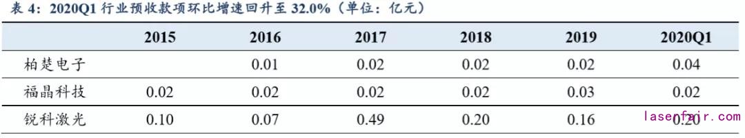 負債端,2019年激光板塊預收賬款合計15.72億元,同比下滑1.1%,2020Q1 行業(yè) 預收款項較 2019 年回升,合計 20.75 億元,環(huán)比+32.0%,其中柏楚電子、大族激光增幅居前,預收款項分別環(huán)比增長138%/100%。資產(chǎn)端,2019 年激光板塊存貨規(guī)模共計 62.07 億元,同比+3.8%。2020Q1 存貨規(guī)模增速較 2019 年回升,存貨規(guī)模合計 71.77 億元,環(huán) 比+15.6%,其中杰普特、柏楚電子、銳科激光增幅居前,存貨規(guī)模分別環(huán)比增長62%/34%/27%,主要系原材料儲備增多以支撐后續(xù)生產(chǎn)。預收賬款+存貨環(huán)比改善顯示行業(yè)趨穩(wěn),將支撐 2020 年整體業(yè)績修復。