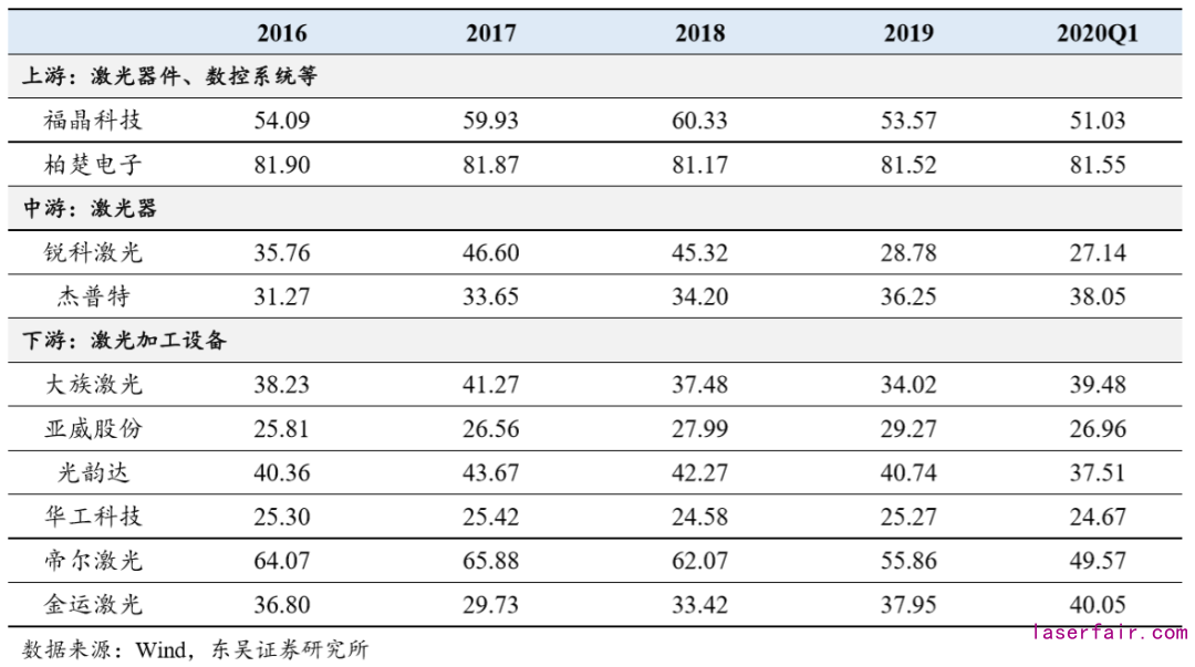 2020Q1激光器企業(yè)毛利率情況出現(xiàn)好轉(zhuǎn)。2019H2后IPG未跟進激光器降價,我們預計IPG將退出價格戰(zhàn),將更多精力轉(zhuǎn)向歐美小而美的定制化市場,大規(guī)模、結(jié)構(gòu)性價格戰(zhàn)將結(jié)束。預計2020年激光器整體價格下降幅度為20%-30%(光纖激光器市場價格正常降幅),降幅較 2018H2+2019H1的50%降幅顯著趨緩,激光器企業(yè)毛利率將逐步修復上行。