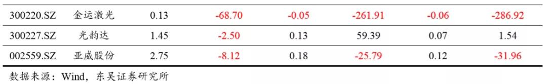 2020年Q1營收增速最高/最低的分別為帝爾激光/金運激光,營收增速分別為 21.66%/-68.70%;歸母凈利潤增速最高/最低的分別為光韻達/金運激光,凈利潤增速分別為59.39%/-261.91%。行業(yè)整體受到疫情影響較為嚴重,隨著各企業(yè)陸續(xù)復工復產(chǎn),各企業(yè)經(jīng)營將恢復正常。