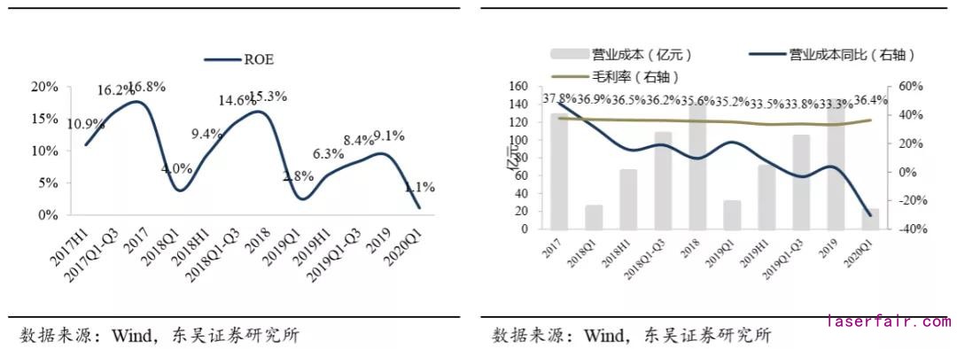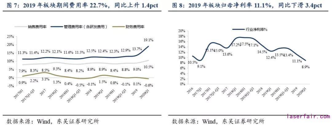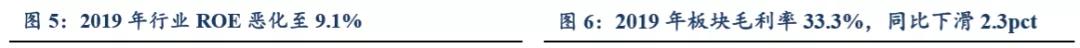 2019年板塊毛利率為33.3%,同比-2.3pct,盈利能力下滑。2020Q1板塊毛利率36.4%。同比+1.2pct,Q1 行業(yè)毛利率首度回升。