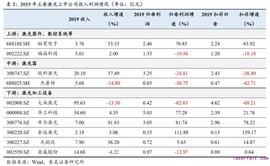 分公司來看,2019年營收增速最高/最低的分別為帝爾激光/杰普特,營收增速分別為91.83%/-14.80%;歸母凈利潤增速最高/最低的分別為金運激光/大族激光,凈利潤增 速分別為 111.88%/-62.63%。