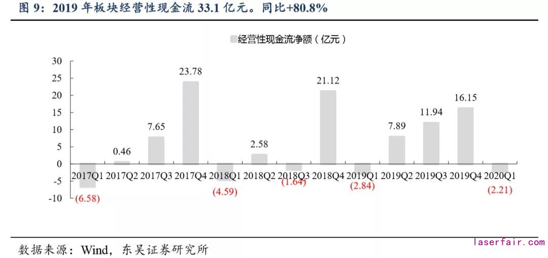 現(xiàn)金流凈額整體日益健康。2019年經(jīng)營性凈現(xiàn)金流凈額為33.1億,同比+80.8%, 規(guī)模創(chuàng)近年歷史新高,主要系華工科技、大族激光、柏楚電子等激光加工設(shè)備及設(shè)備數(shù)控系統(tǒng)企業(yè)銷售回款良好,華工科技、大族激光、柏楚電子2019年經(jīng)營性現(xiàn)金流凈額分別為4.13/21.23/2.40億元,同比增長 782.1%/166.6%/72.1%;2020Q1激光板塊經(jīng)營性凈現(xiàn)金流凈額為-2.2億,同比+22.0%,現(xiàn)金流情況整體保持健康。
