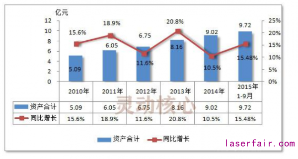 2015年1-9月,我國光纖激光器行業(yè)資產(chǎn)合計達(dá)到了9.72億元,同比增長了15.5%。2014年,我國光纖激光器行業(yè)資產(chǎn)合計達(dá)到了9.02億元,同比增長了10.5%。