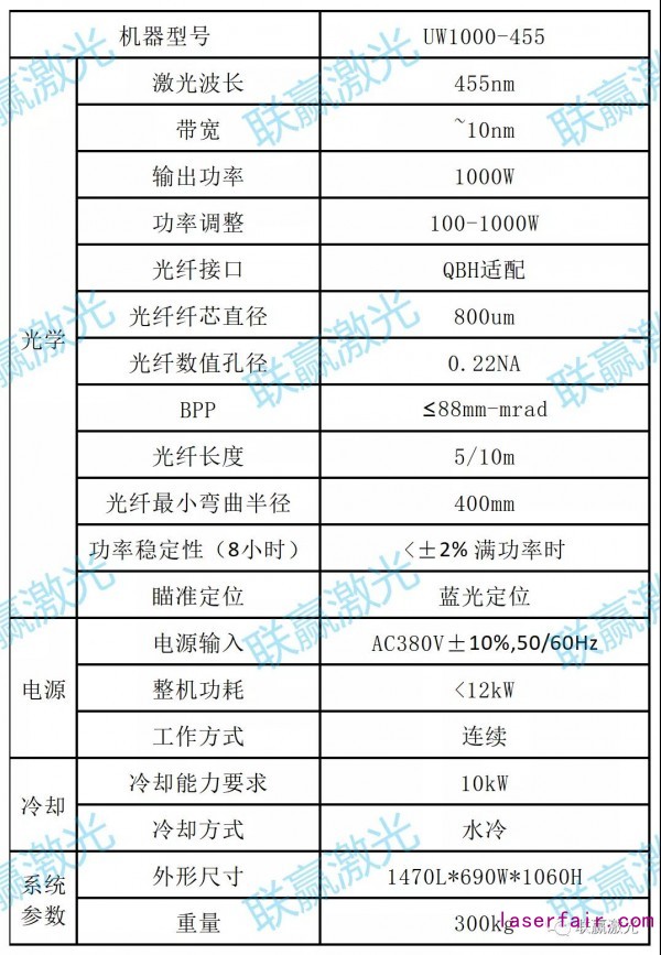 根據(jù)上述技術(shù)背景,聯(lián)贏激光潛心研發(fā),推出了在國際上亦處于先進水平的國內(nèi)首款自主研發(fā)的高功率千瓦級藍光激光器,實測最高輸出功率高達1.1kw。