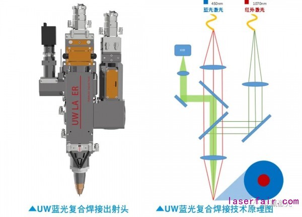藍光復(fù)合焊接技術(shù)是通過聯(lián)贏自主研發(fā)的藍光復(fù)合焊接出射頭(如下圖所示)將紅外激光及藍光激光復(fù)合在一起,使兩束激光的軸線在空間上重合(如下圖所示),紅外激光進行深熔焊接,藍光激光具備預(yù)熱緩冷的作用,并適度進行熱傳導(dǎo)焊接。