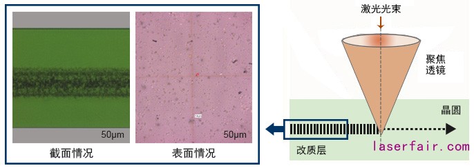 激光隱形切割作為激光切割晶圓的一種方案,很好的避免了砂輪劃片存在的問(wèn)題。如圖1所示,激光隱形切割是通過(guò)將脈沖激光的單個(gè)脈沖通過(guò)光學(xué)整形,讓其透過(guò)材料表面在材料內(nèi)部聚焦,在焦點(diǎn)區(qū)域能量密度較高,形成多光子吸收非線性吸收效應(yīng),使得材料改性形成裂紋。每一個(gè)激光脈沖等距作用,形成等距的損傷即可在材料內(nèi)部形成一個(gè)改質(zhì)層。在改質(zhì)層位置材料的分子鍵被破壞,材料的連接變的脆弱而易于分開(kāi)。切割完成后通過(guò)拉伸承載膜的方式,將產(chǎn)品充分分開(kāi),并使得芯片與芯片之間產(chǎn)生間隙。這樣的加工方式避免了機(jī)械的直接接觸和純水的沖洗造成的破壞。目前激光隱形切割技術(shù)可應(yīng)用于藍(lán)寶石/玻璃/硅以及多種化合物半導(dǎo)體晶圓。