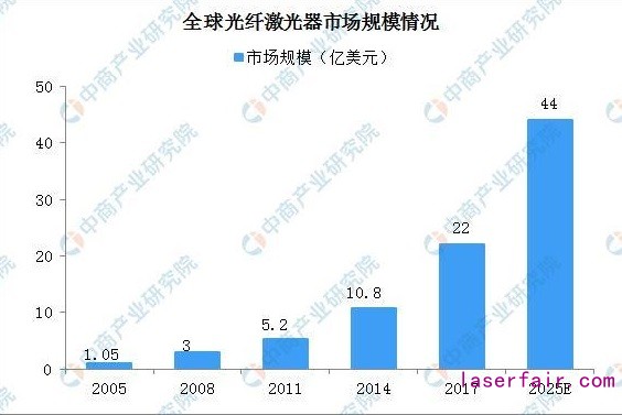 按照增益介質(zhì)的不同,激光器主要可分為液體激光器、氣體激光器、半導(dǎo)體激光器、光纖激光器和固體激光器等。光纖激光器屬于新一代固體激光器的一種,具有光電轉(zhuǎn)換效率高、結(jié)構(gòu)簡(jiǎn)單、光束質(zhì)量好的特點(diǎn)。根據(jù)浙商證券的研究報(bào)告,全球光纖激光器在工業(yè)激光器中的市場(chǎng)份額保持逐年上升,逐漸成為市場(chǎng)份額最大的工業(yè)激光器,預(yù)計(jì)到2025年全球光纖市場(chǎng)的規(guī)模將達(dá)到44億美元。