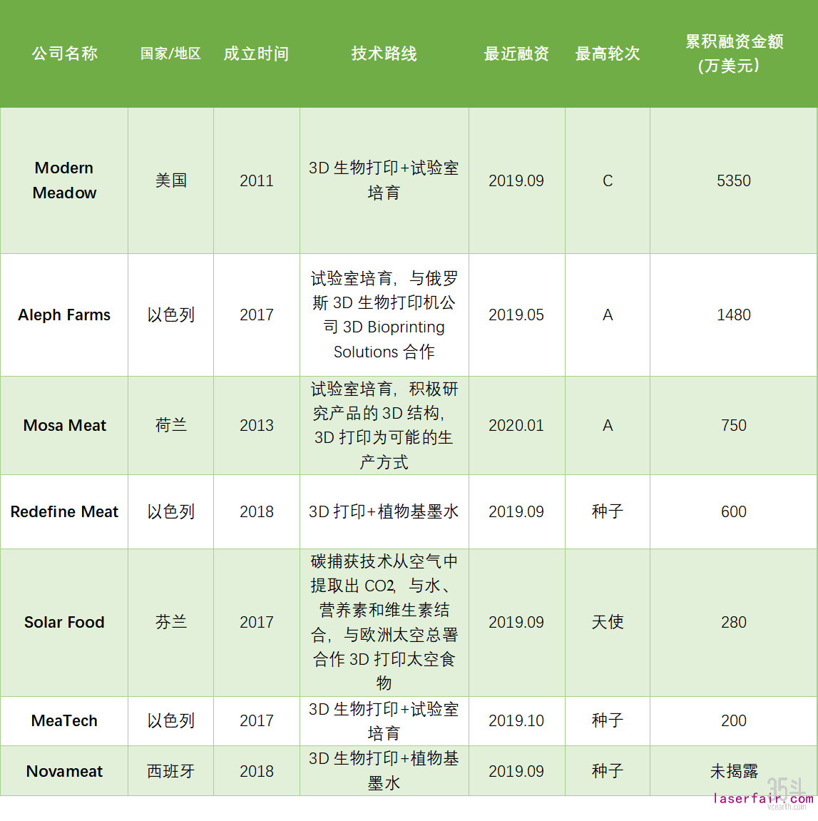 引人注意的是,唯一的C輪企業(yè)Modern Meadow已經(jīng)轉(zhuǎn)向作人造皮革,也許是人造皮革市場利多,也許是替代肉品市場競爭過高,又也許技術(shù)復(fù)雜的培育肉問世過程漫長,但值得慶幸的是,資本市場開始注意到3D打印概念企業(yè),7家企業(yè)最近一輪融資都在一年內(nèi)完成,其中5家企業(yè)集中在2019年第四季。