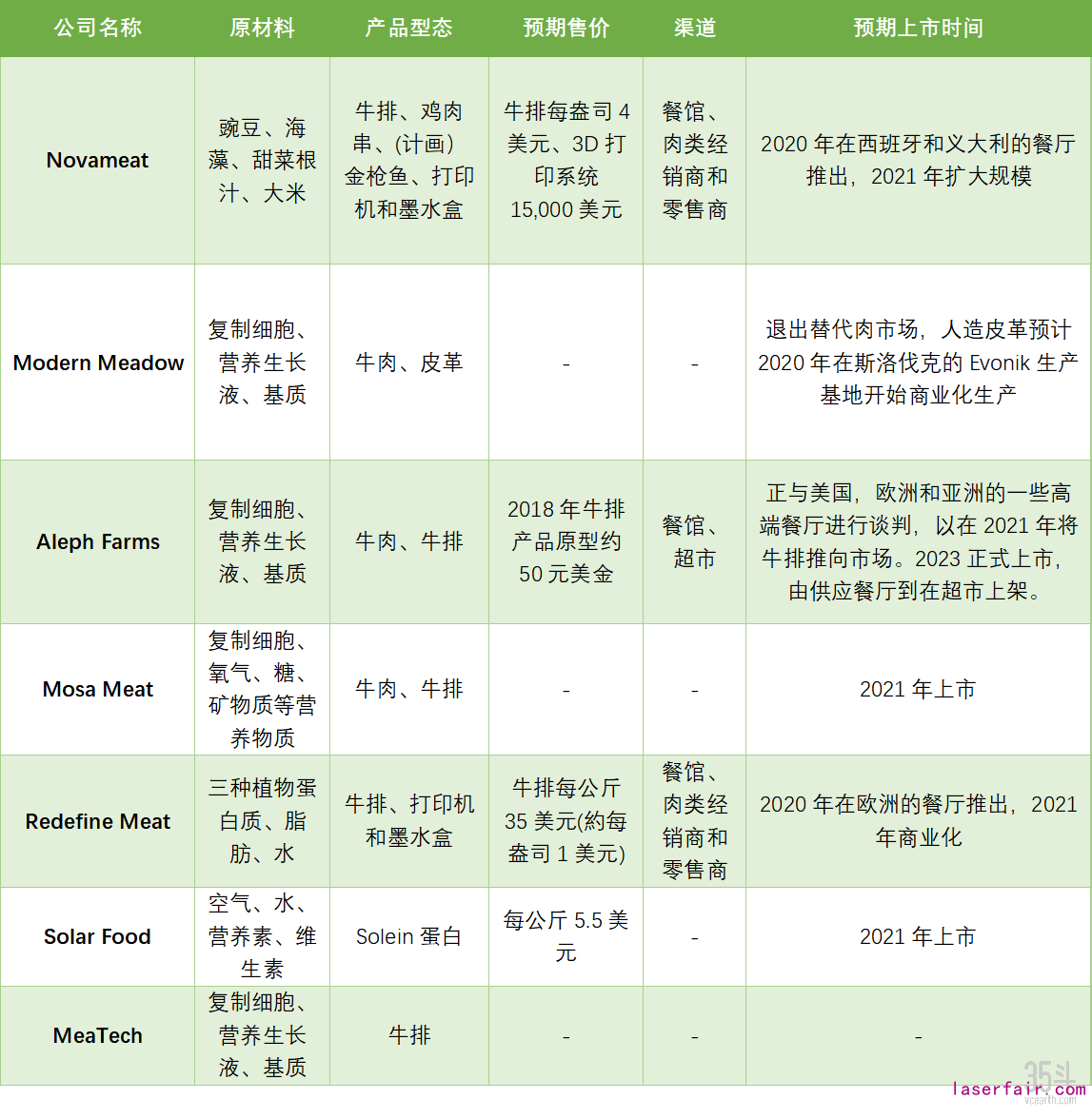 原材料方面,4家企業(yè)是從活體干細胞取材,然后進行復(fù)制和培育,2家是以植物蛋白為主,1家則是從空氣中提取出二氧化碳后,再與水、營養(yǎng)素和維生素結(jié)合制成非動物性蛋白。