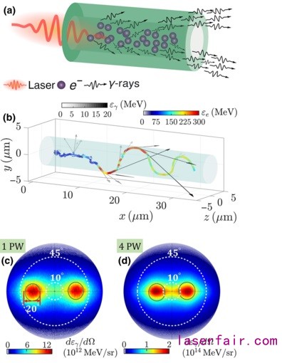 (b)電子軌道,其中灰度是指電子發(fā)射時(shí)的方向和能量,(c-d)激光能量為1和4PW市得到的伽馬射線