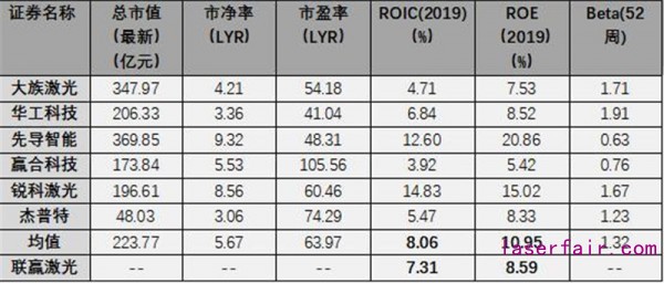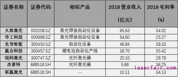 激光焊接行業(yè)屬于技術(shù)密集型行業(yè),聯(lián)贏激光是國(guó)內(nèi)少數(shù)幾家專注于激光焊接的規(guī)模型企業(yè),同行業(yè)中并沒有完全一致的可比公司,在A股中與聯(lián)贏激光有一定可比關(guān)系的上市公司如下: