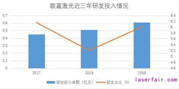 在研發(fā)方面,截至2019年12月31日,聯(lián)贏激光擁有激光焊接相關(guān)專利125項(xiàng),其中發(fā)明專利19項(xiàng),另外還擁有114項(xiàng)軟件著作權(quán)。2019年聯(lián)贏激光研發(fā)投入金額為0.61億元,占營(yíng)業(yè)收入的6.01%,研發(fā)人員數(shù)量為672人,占總員工數(shù)的40.60%。近三年整體研發(fā)費(fèi)用增長(zhǎng)速度低于整體業(yè)務(wù)規(guī)模增長(zhǎng)速度,因此在2019年聯(lián)贏激光加大了研發(fā)投入,研發(fā)占比有所回升,具體情況如下所示: