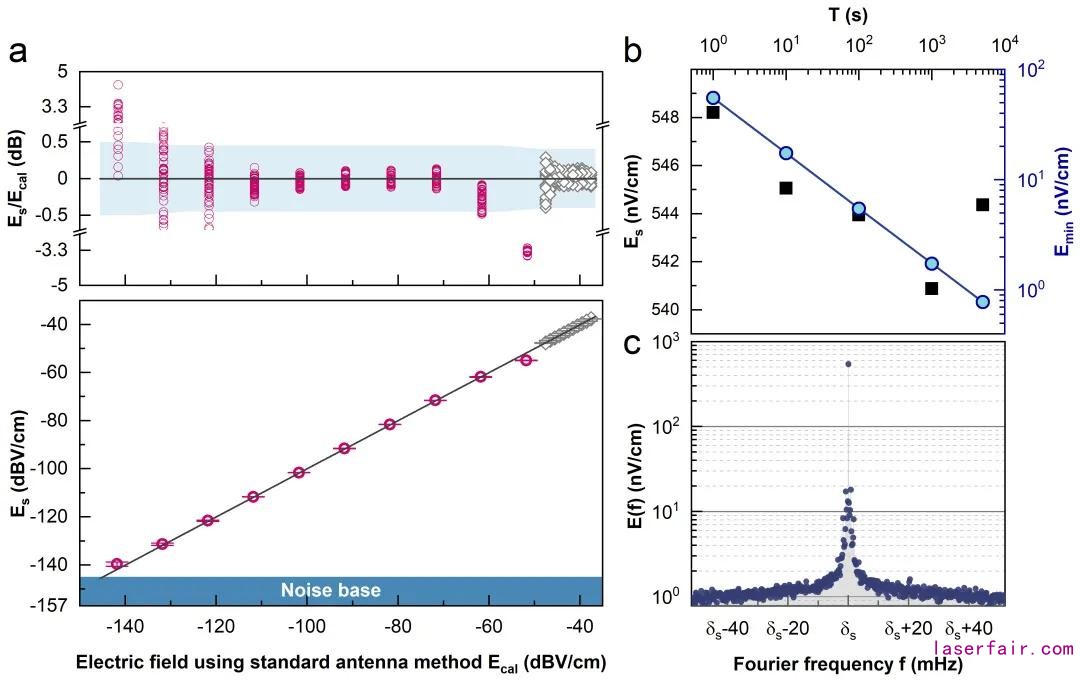 圖2:原子超外差測量方法進(jìn)行微波電場絕對值測量的實驗結(jié)果。超高靈敏度的原子超外差測量方法實現(xiàn)了可溯源極微弱微波電場測量。