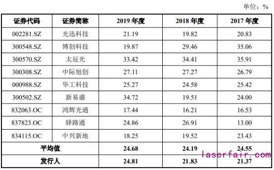 仕佳光子2017年、2018年毛利率低于同行均值,2019年其毛利率上漲反超同行均值。2017年-2019年,仕佳光子毛利率分別為21.37%、21.83%、24.81%,同行平均值分別為24.55%、24.19%、24.68%。