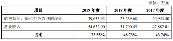 2017年-2019年,仕佳光子營業(yè)收入分別為4.79億元、5.18億元、5.46億元。銷售商品、提供勞務(wù)收到的現(xiàn)金分別為2.09億元、2.52億元、3.96億元,占營收的比例分別為43.74%、48.73%、72.55%。各期銷售商品、提供勞務(wù)收到的現(xiàn)金始終遠(yuǎn)低于同期營收。