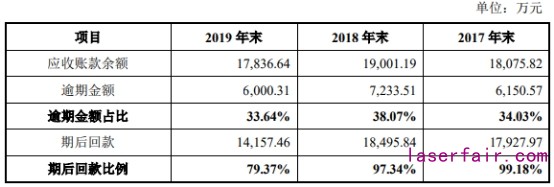 2017年末-2019年末,仕佳光子應(yīng)收賬款余額分別為1.81億元、1.90億元、1.78億元,其中逾期金額分別為6150.57萬元、7233.51萬元、6000.31萬元,逾期金額占比分別為34.03%、38.07%、33.64%。期后回款金額分別為1.79億元、1.85億元、1.42億元,期后回款比例分別為99.18%、97.34%、79.37%。各期仕佳光子應(yīng)收賬款凈額分別為1.71億元、1.79億元、1.68億元,占營業(yè)收入比例分別為35.71%、34.62%、30.83%。